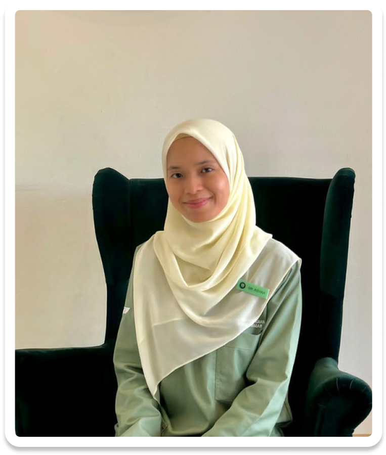 Dr. Aisyah ialah graduan Universiti Al-Azhar, Kaherah, Mesir dengan 5 tahun pengalaman. Beliau memberi tumpuan kepada rawatan pergigian kanak-kanak dan kini berkhidmat sebagai doktor gigi tetap di Klinik Pergigian Nurul Akmar Kuala Kangsar.